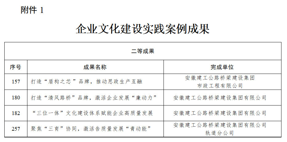 近日,中國施工企業管理協會發布2025年企業文化建設實踐案例成果,公司選送的案例《打造“盾構之芯”品牌,推動思政生產互融”》《打造“清風路橋”品牌,激活企業發展“廉動力”》《“三位一體”文化建設體系賦能企業高質量發展》《聚焦“三育”協同,激活高質量發展“青動能”》,從全國1000余個參評案例中脫穎而出,成功入選企業文化建設實踐案例二等成果,充分展現了公司多年來在企業文化建設方面的累累碩果。