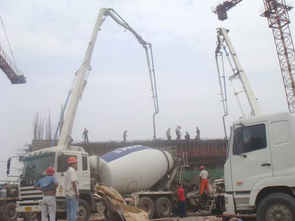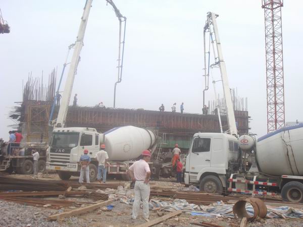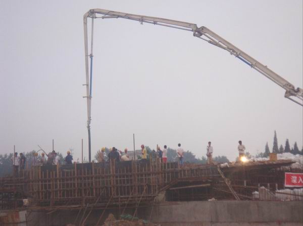 盛夏季節,驕陽似火。經項目部科學組織、精心準備、合理安排,2009年6月21日上午六安市淠望路大橋工地上人頭攢動、機器轟鳴,兩臺混凝土泵車高高聳立在大橋主墩0#塊上面。九時許,經現場監理組和業主驗收后,淠望路大橋主墩0#塊開始澆注混凝土,現場施工人員克服高溫酷暑天氣,經過個5個多小時的連續奮戰,于當天下午三點順利完成混凝土的澆筑工作。